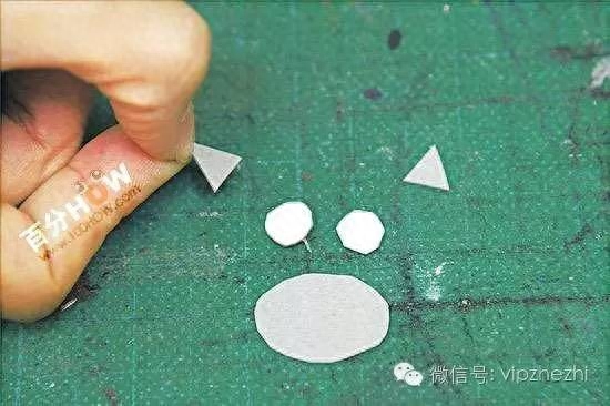 2,拿出厚纸板,用剪刀剪出下面这些形状:1个椭圆形的鼻子、2个小圆眼睛、2个三角形耳朵。