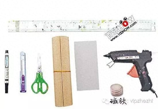 热胶枪、尺子、马克笔、美工刀、剪刀、瓦楞纸4开大小一张、双色厚纸板5x10cm。强力磁铁一颗。