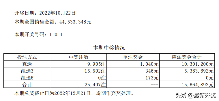 接着就是排列三了,本期的排列三为第22281期,开奖号码为101,首位得1直掉,和值是2点,跨度是1,路数是101路,组选3 的形式的,何谓的组选三呢?就是对子的形式的,本期开出的直选注数为9,905注,单注奖金1040元,组选三中出15,502注,单注奖金346元。