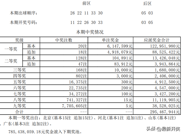首先是大乐透了,其实按照个人觉得应该是每天的排列三和排列五先摇奖了,然后擦拭重头戏大乐透了,但是既然先大乐透,那么我们也先来看看大乐透了,本期为大乐透第22120期,本期的开奖号码为:11 22 26 30 33+03 05,没有一个重号,后区的连号也没有出来,那么彩民们的中奖情况如何呢?本期也是小小的井喷了一下,中出20注的头奖,单注奖金6,147,599元,其中有18注追加,每注多得4,918,079元,本期一等奖出自:北京(基本15注 追加15注)、河北(基本1注 追加1注)、山东(基本1注) 、广东(基本3注 追加2注)。这样看来北京的这15注很可能是同一个人所中,那么十五注追加的话,奖金超过一个亿了,真是紧跟昨天的双色球。二等奖128注,单注奖金104,891元,其中47注追加,多得奖金83,912元。