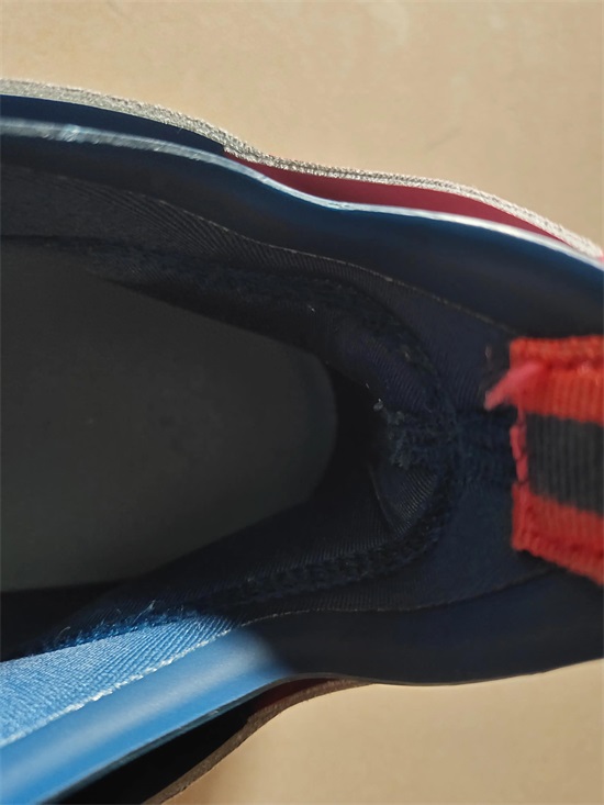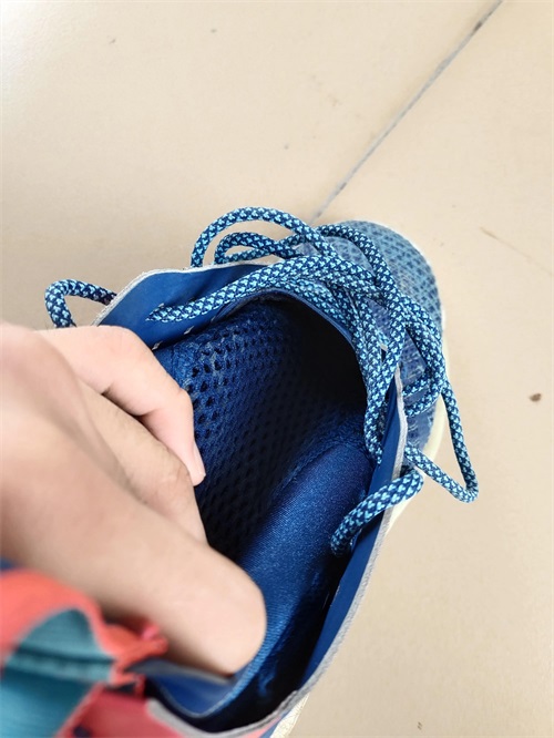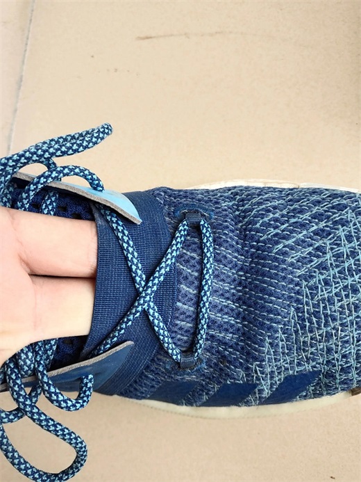可以看到在足弓上面一点处的位置的鞋上,有一个束脚带,他是紧紧连接前半掌鞋面和中底的,一体!这个束脚带的材质应该是类似于橡皮筋那种,很有韧性和弹性。