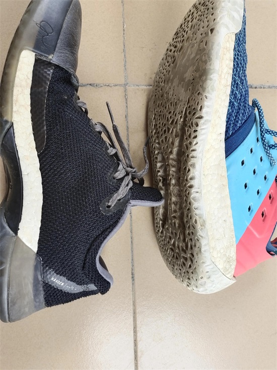 所以说看到阿迪达斯boost系列跑鞋搭载的boost很少被包裹到,因为不需要,这也就是为什么跑鞋搭载的boost和篮球鞋其实调教的程度是不一样,在篮球鞋上面,它会调教的把这个现象更加收敛一点,再加上硬质橡胶包裹,你会有更好的包裹性和稳定性,但可以看到哈登2和CE这双鞋在硬质橡胶包裹方面是有区别的,哈2是前掌,CE是全掌,各有千秋。
