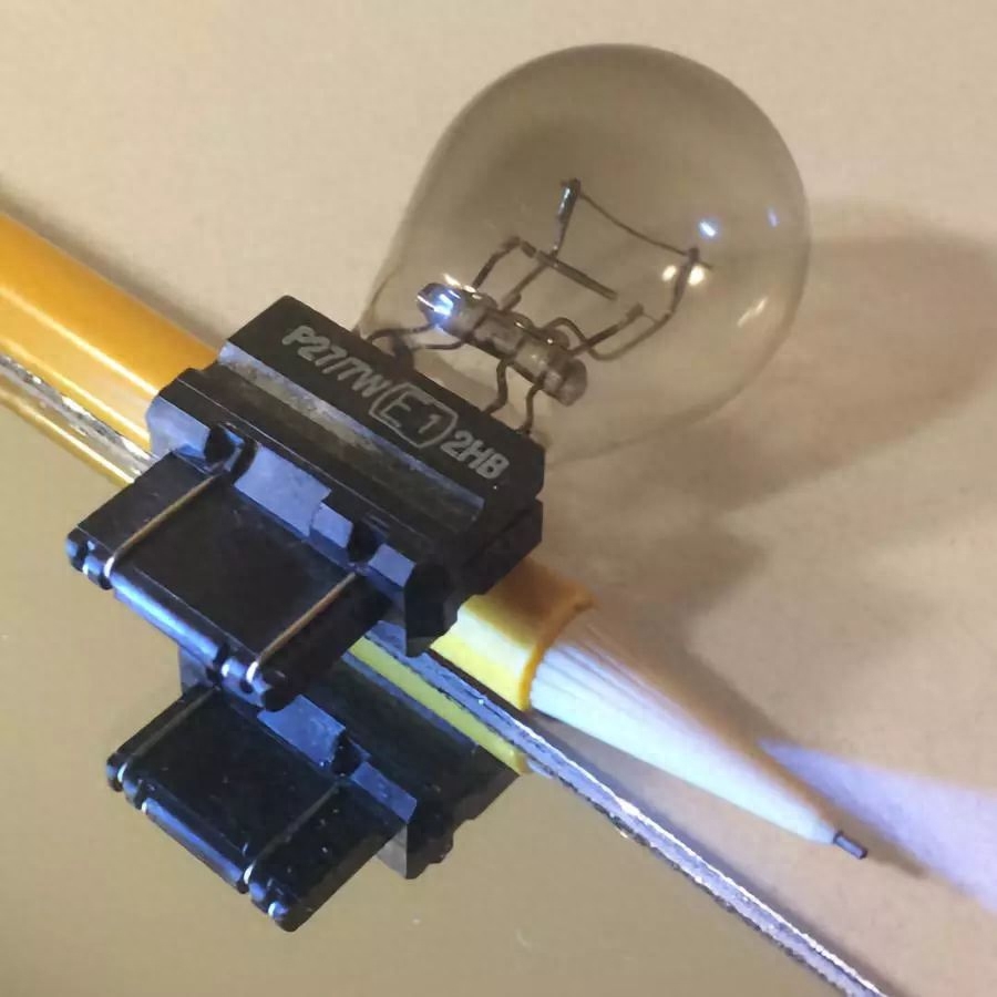 在讨论高大上的电子技术之前,我们先看一个相对比较土的例子。下图是一个汽车尾灯的灯泡,里边有两组灯丝。一组灯丝发光比较弱,用于夜间向后面的司机标示车辆的位置。另一组灯丝比较亮,用于拐弯时的闪光信号以及刹车时的警示。