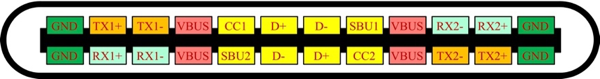 USB-C 插口有 24 个接脚,每个接脚的定义如下图。