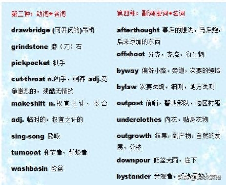 英语中有一部分词汇是复合词,什么是复合词呢?复合词就是由两个或两个以上的单词组合在一起构成的词,例如我们熟悉的policeman,policewoman就是复合词。但是英语中还有过很多像它们一样的复合词,我们一起来学习一下吧!