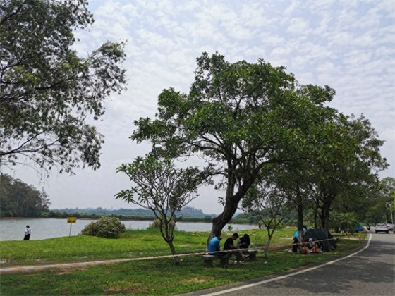 当我们驱车进入同沙生态公园,不得不感叹这个地方,真的太大了。因为整个园区面积4000公顷,其中山林面积3000公顷,湖水面积1000公顷。我们沿着环湖公路行驶,在这条长达15公里的道路上,基本上都是绿树成荫。不得不说,这是市区里度假的好地方,怪不得有那么多人选择来这里露营,踏春,骑行。