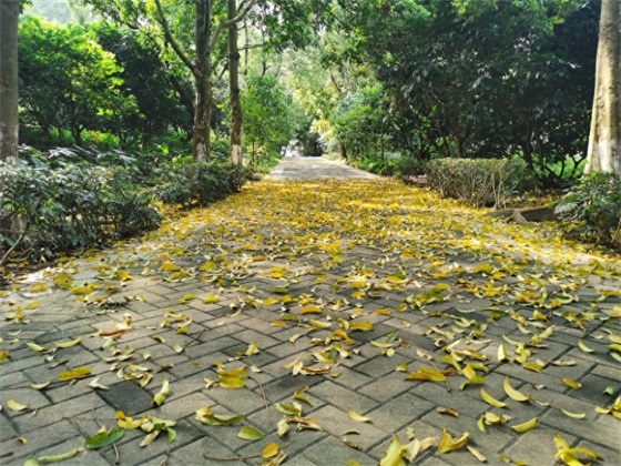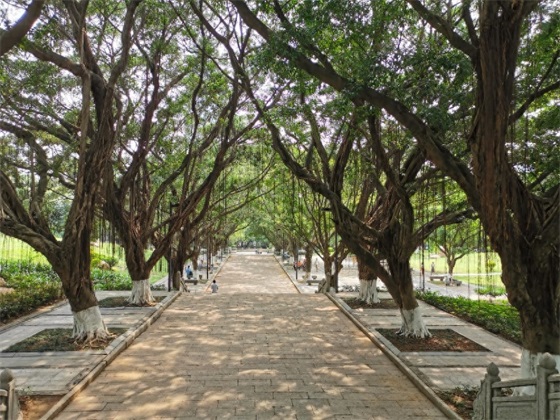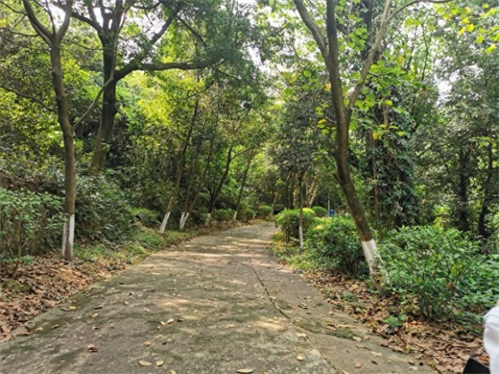 旗峰公园,自唐宋以来便有一定的名气,特别是黄旗山,形似旗展,唐代以前称“黄岭”,是东莞的象征,山下有建于宋代的黄旗观音古庙,逢年过节,游人如潮。所以在这里,道路两旁的树木有一定的年纪,长得比较茁壮。这条路主要是通向古庙的。不过现在疫情还没有完全过去,所以古庙还没有开放。