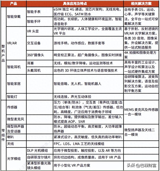 精密零组件业务聚焦于:声学、光学、微电子、结构件等产品方向,主要产品包括微型扬声器/受话器、扬声器模组、触觉器件(马达)、无线充电器件、天线、MEMS 声学传感器、其他 MEMS 传感器、微系统模组、VR 光学器件及模组、AR 光学器件、AR 光机模组、精密结构件等,上述产品广泛应用于智能手机、平板电脑、智能无线耳机、VR 虚拟现实、AR 增强现实、智能可穿戴、智能家居等终端产品中。