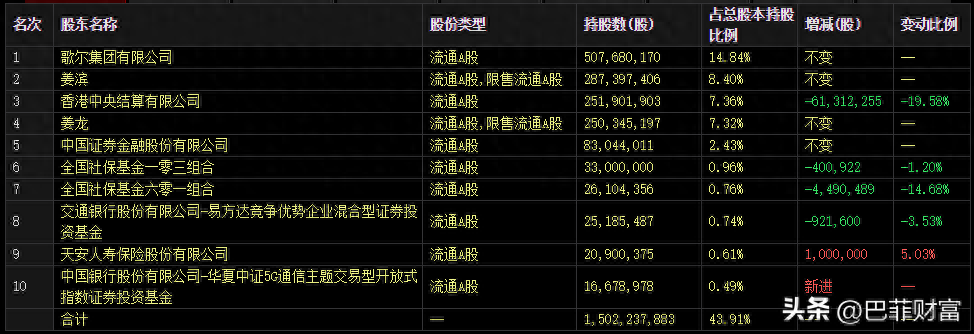 公司控制股东:歌尔集团有限公司持有歌尔股份14.84%股权,姜滨、胡双美是歌尔股份的实际控制人,分别直接和间接持有歌尔股份22.14、0.47%股权。前十大股东中,两家社保基金分别为第六、七大股东,但在Q3均有所减持。
