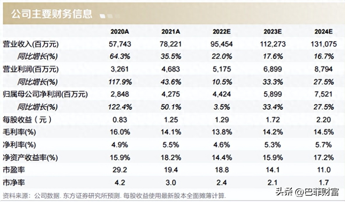 公司下半年业绩不及预期,市场普遍下调公司未来三年的业绩指引,普遍对公司2022—24年盈利预期均下调了约两成,中信、华泰、东方证券等多家券商对公司盈利预测相近。东方证券预计公司2022-2024年营业收入为954.54/1122.73/1310.75亿元,同比增长22%/17.6%/16.7%;实现归母净利润44.24、58.99和75.21亿元,同比增长3.5%/33.4%/27.5%,截止11月25日股价17.61元对应PE 13.6/10.2/8.0/倍。估值处于较低水平。