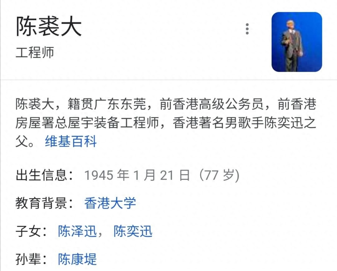 他是香港歌王陈奕迅的父亲,原香港房屋署总屋宇装备工程师陈裘大。