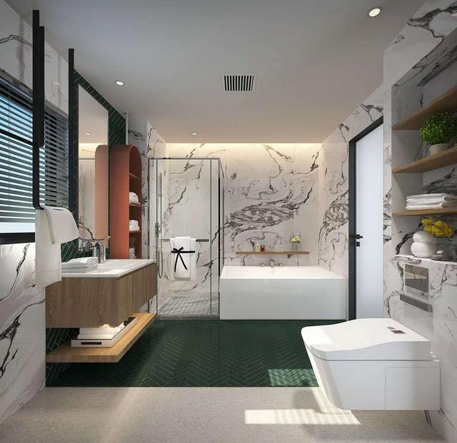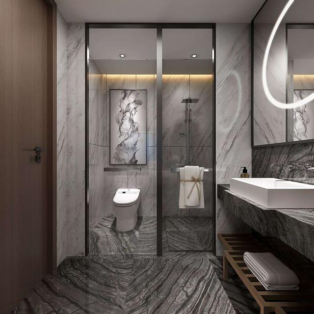 干湿分离的卫生间,多喜爱运用大理石在装饰墙壁,整个卫生间带有低调的奢华。