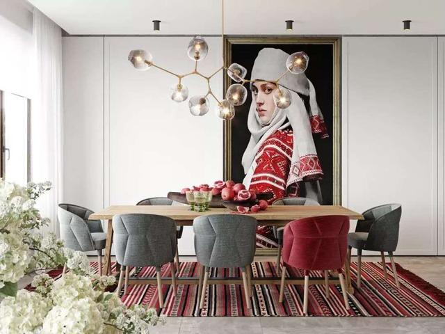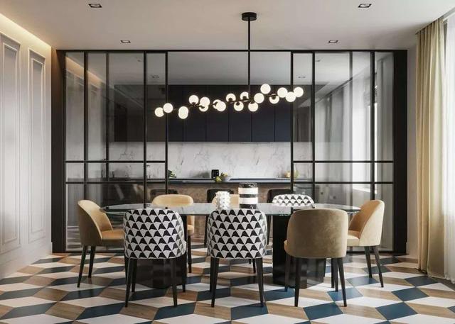 也可以玩点不一样的元素,餐桌下面铺设六边形花砖或者地毯,能增亮整个空间。