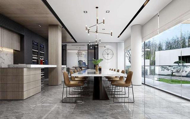 木色橱柜搭配大理石餐桌,配色棕色餐椅,一切显得那么奢华。