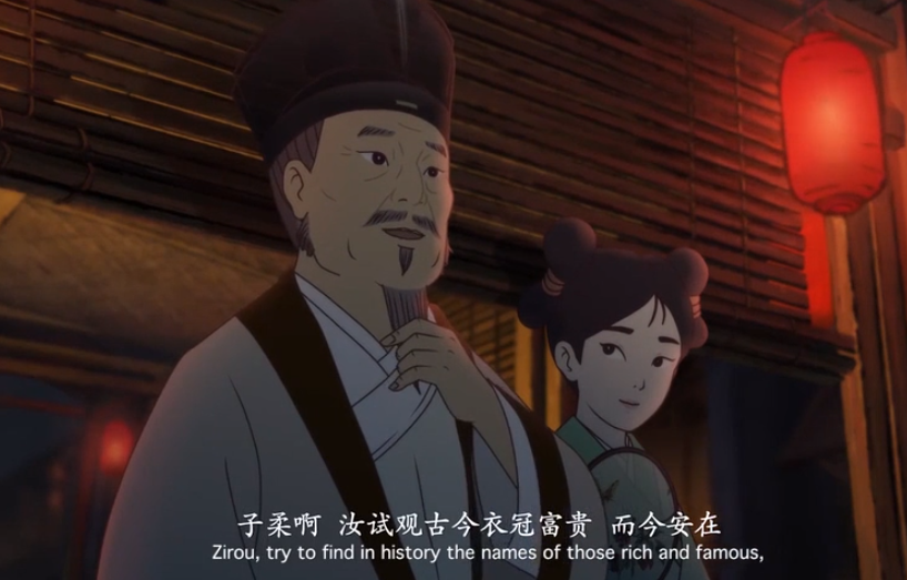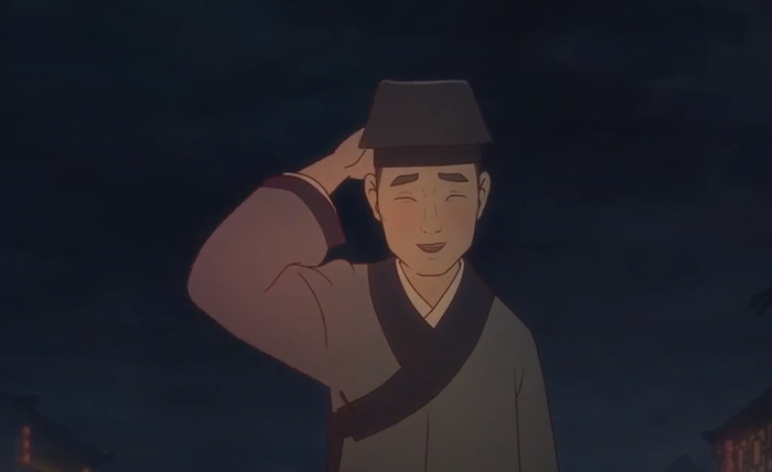 动画开场,娄坚灰头土脸、东冲西撞,导演了近3分钟来突出他落第后的苦闷。而游湖那天正值中秋佳节,湖畔旁华灯初上,节日的流光溢彩与娄坚落第的闷闷不乐形成鲜明对比。在节日欢乐的氛围下,娄坚的愁肠百结尤为显著。