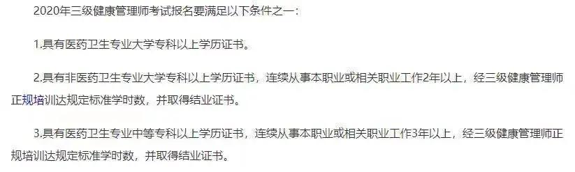 4、是所有人都能考健康管理师吗?不是!目前官方发布的文件中,想要报考健康管理师必须满足以下条件之一:(1)具有医学卫生专业大学专科以上学历证书。(2)具有非医药卫生专业大学专科以上学历证书,连续从事本职业或相关职业工作2年以上,经三级健康管理师正规培训达规定标准学时数,并取得结业证书。(3)具有医药卫生专业中等专科以上学历证书,连续从事本职业或相关职业工作3年以上,经三级健康管理师正规培训达规定标准学时数,并取得结业证书。