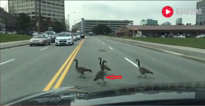视频中的13只鹅在58秒内都没有过完马路,居然还有一只回头想重新再来一遍。