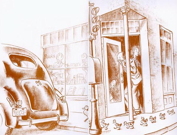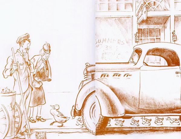 (出版这本书的时候是第二次世界大战之前,作者希望全彩印刷出版这本书,但是,全彩印刷实在是太过昂贵了,何况作者还是一个刚刚步入童书领域、从未经过考验的新手。于是,麦克洛斯基不得不决定仅仅封面用绿色。他选择了棕色墨水作为最终用色,这是因为棕色比黑色更显得温暖,也更接近鸭子的颜色。)