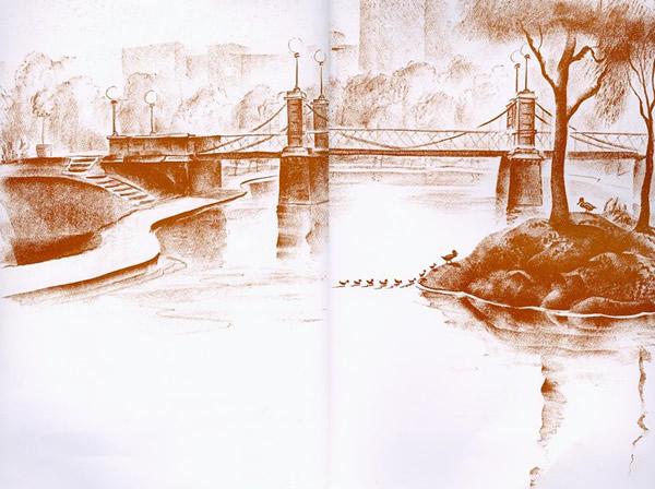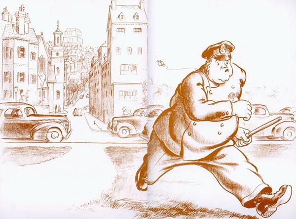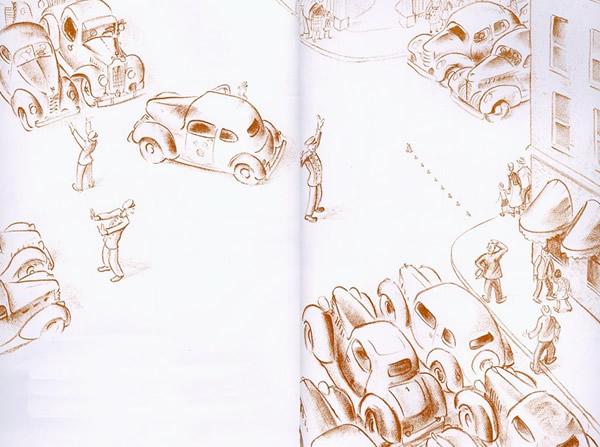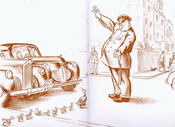 《纽约时报》的书评说:这是一本仁慈的书。是的,人与自然和谐共处,是这本七十多年前创作出的、开本巨大的图画书的一个不言而喻的主题。作者用深褐色、略带那么一点暖暖的暗红色的笔触,画了一个警察拦下所有车辆,护送排成一排的鸭子过马路的温情脉脉的故事。