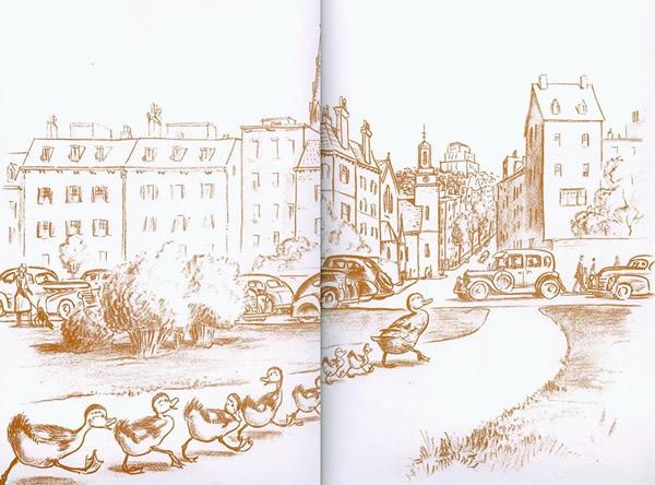(多年来,有些读者一直在质疑鸭爸爸“马拉先生”是个游手好闲、不称职的父亲。但是野鸭的爸爸们的的确确会把照料小鸭的工作丢给母鸭,自己一走了之;也许说不定母鸭会觉得这样更好些。所以,关于这种鸟类行为的细节,就像鸭嘴的细节一样,作者麦克洛斯基只是遵守了自然规律而已。)