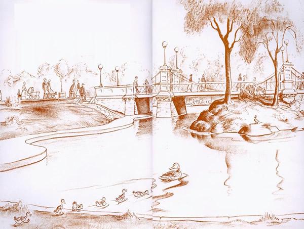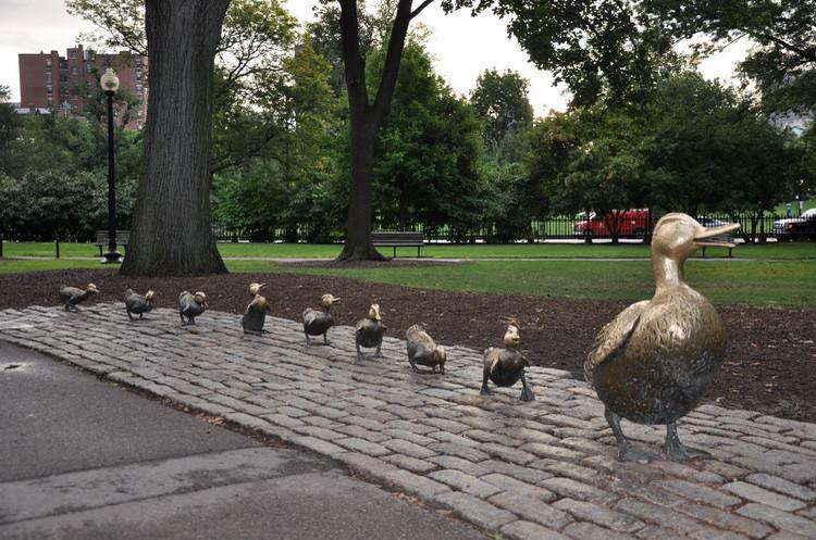 1987年,波士顿公园150周年庆典时,雕塑家南希·舍恩(Nancy Schon)将“马拉夫人”和她著名的家人的铜像复制品安置在了铁栅栏门旁不远处。这个门也因为这本书而声名远播。每逢节假日,成百上千的孩子们就会跑去触摸这些铜塑。现在,这些被摸得发亮的铜塑就像一座不朽的纪念碑,颂扬着《让路给小鸭子》这本书的不朽魅力。