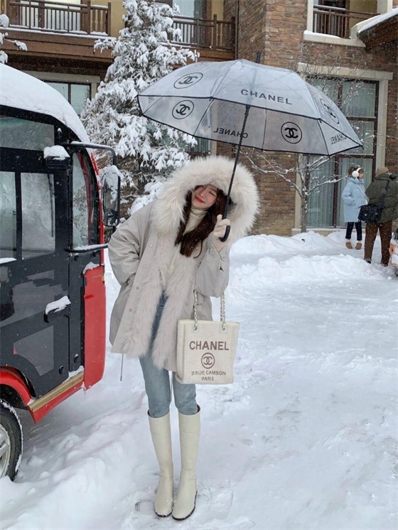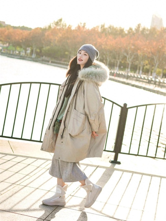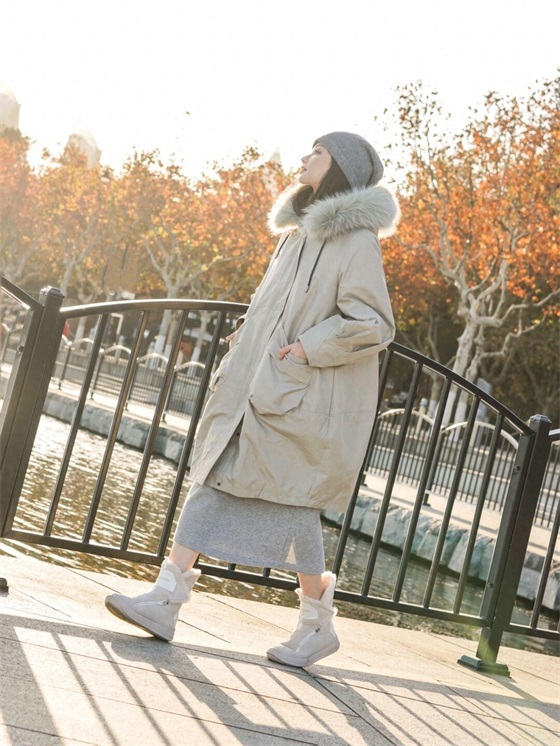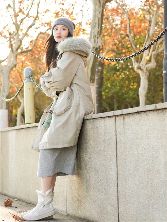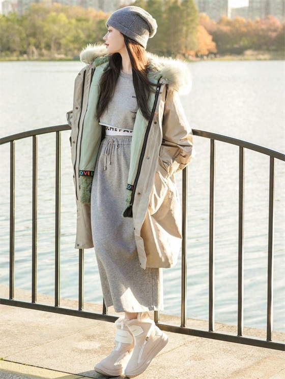 内搭中的半身裙还是比较长的,一直到小腿的部位,这就能与派克服的衣摆形成比较丰富的层次,会强化腿部的保暖,不过半身裙多多少少会露出部分肌肤在空气中,如果你怕冷,搭配一双长筒雪地靴会很好的保暖。