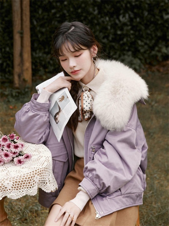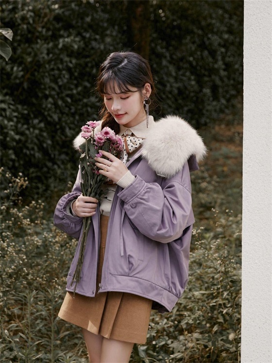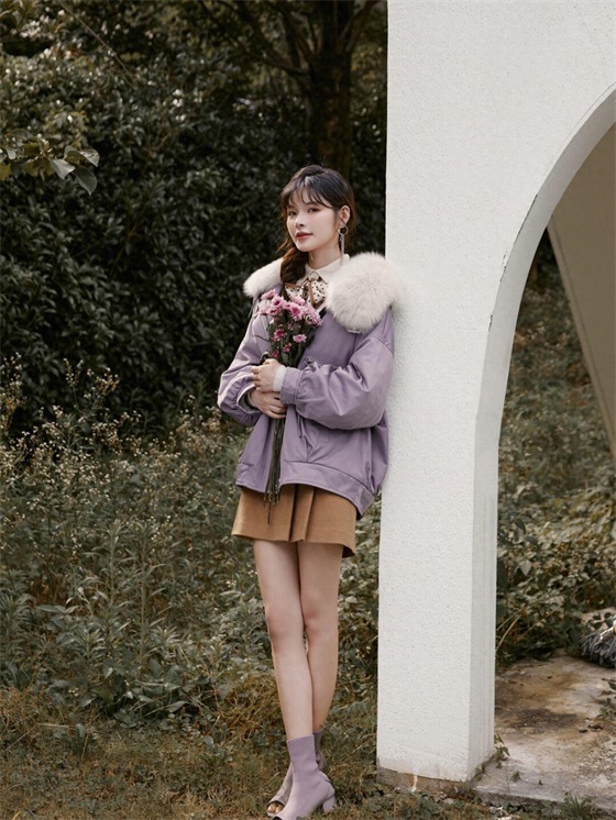 接下来为你介绍的是一款短派克服,是值得各位小个子甜妹入手的款式,香芋紫的配色多了几分灰色调,所以显白不挑人,而且还很衬肤色白皙,与洁白的毛领结合后就会打造出视觉上的冲击,时髦又洋气。