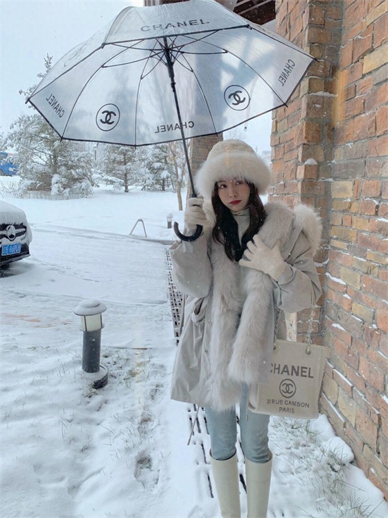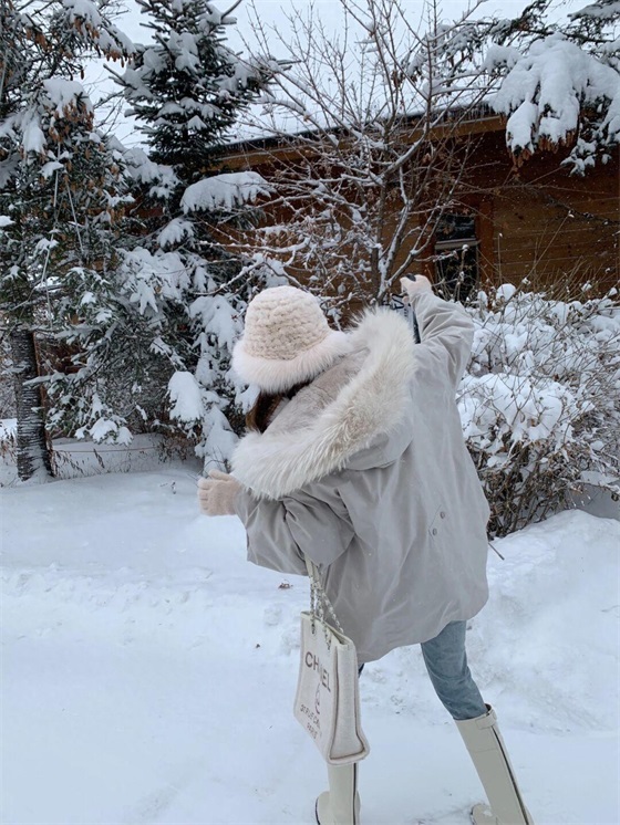 为你分享的第二款派克服就是这件浅灰色的款式,这个颜色就属于比较基础的冷色调了,虽然不似纯白色那么纯洁,但是多了几分高级的质感,更适合白雪皑皑的天气,灰色的绒毛帽子保暖舒适,配上同款针织帽更保暖。