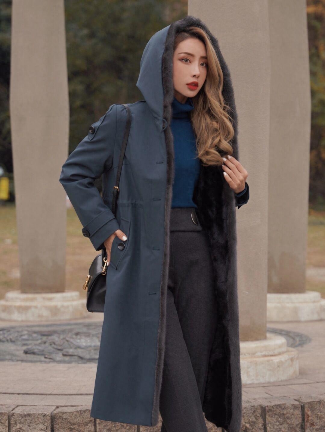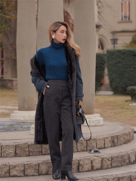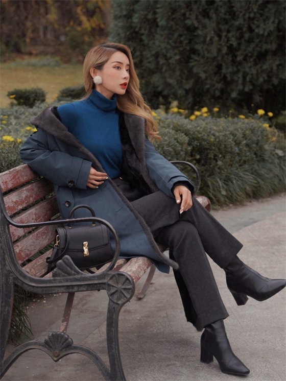 对于成熟的大女人来说,我建议你入手一款深色系的派克大衣,就像下面这款一样,它以深蓝色为主色调,视觉上就会给人很洋气的感觉,搭配同色系的高领毛衣会让二者形成呼应,提升整体的协调度。