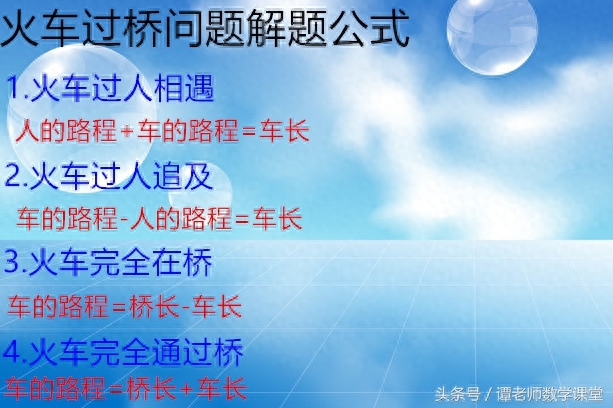 上节课呢,我们讲了小学奥数火车过桥问题的做题方法以及例题详解,并且给同学们找了10道历年的中考真题,下面我再给大家一个做这类题的公式,大家根据题目类型自己套用。如下图