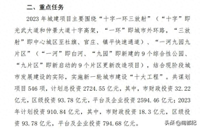 2023年城建项目主要围绕十字一环三放射等重点工程建设。主要内容是十字一环三放射,一河九园九片区,十字是仲景大道和光武大道十字高架快速路,一环是南阳城市外环路,三放射是个老大难问题,就是镇平快速路、社旗快速路和官庄快速路。