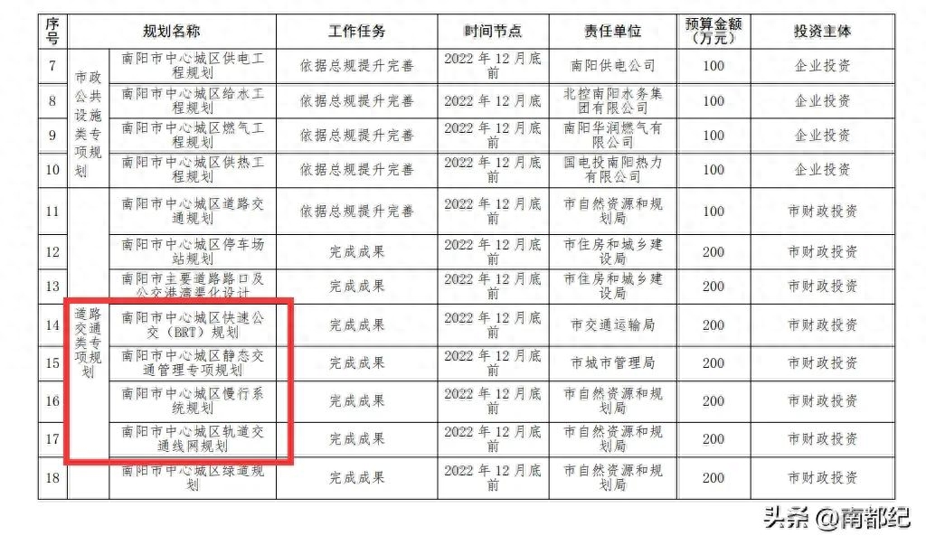 南阳市中心城区快速公交BRT系统规划,2023年完成南阳市中心城区轨道交通线网规划两项任务清单,也是2023年完成。这个难度不大,毕竟只是规划嘛,如果要实施的话,估计快速公交BRT系统应该会上马快一点,毕竟投资会小一点,轨道交通的话,短期内感觉可能性不大。