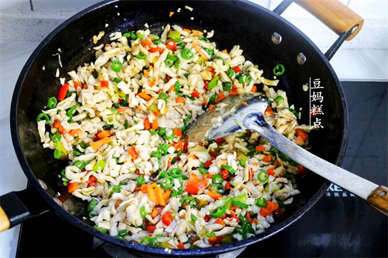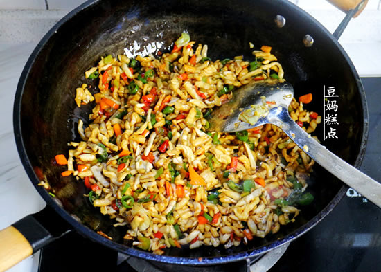 一起不停的翻炒,至辣椒熟,萝卜干感觉变少,表面有轻微的焦黄色。