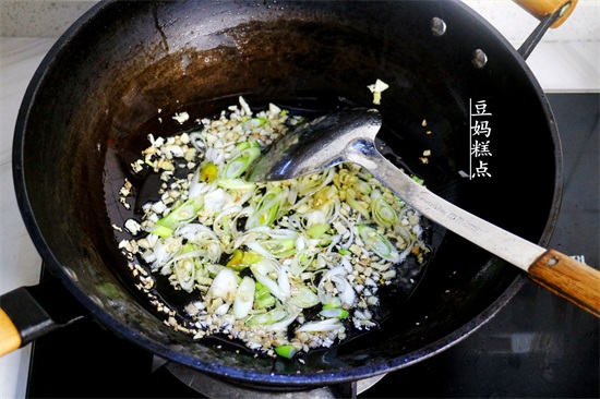 4、加入大葱翻炒均匀。
