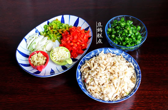 青红辣椒分别切小丁、大蒜切末、生姜切末、大葱切成薄片。