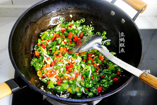 5、倒入所有的辣椒一起翻炒至辣椒变软。