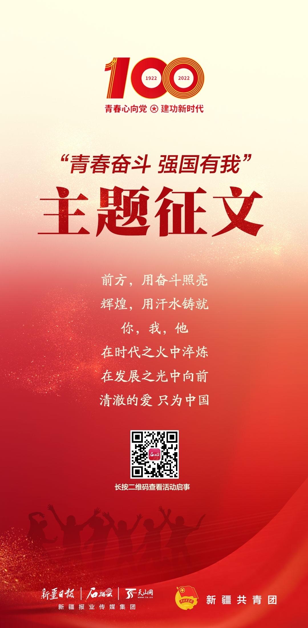 征文主题为“青春奋斗 强国有我”,内容与中国共产主义青年团成立100周年相关即可,可以记录新疆青年在各行各业奋斗拼搏的故事;可以结合自身实际,畅谈自己对国家民族的希冀,对家乡发展的寄语,对热血青春的向往,对美好未来的憧憬等。题目自拟,文体不限。散文、小说、评论、报告文学等以2000字内为佳,诗歌不超过50行。要求原创首发,文责自负。