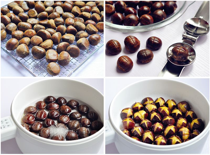 至锅内无水分,干透后打开锅盖,即成个个自动炸开口的糖炒栗子了。