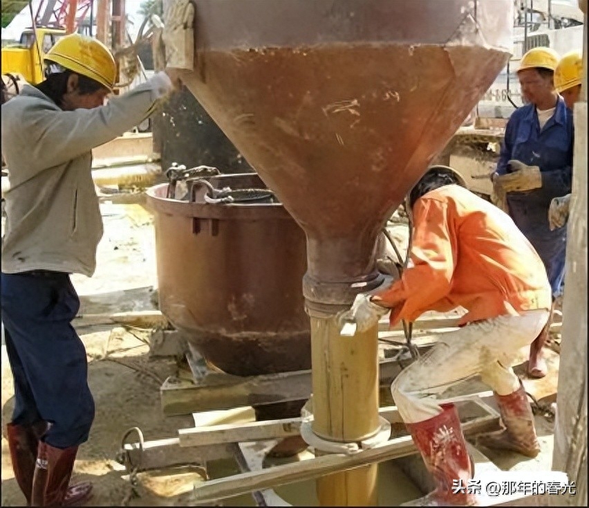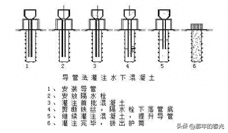 注:在钻成的孔中充满着特制的泥浆,这些泥浆可以平衡土体向孔内施加的压力,可以防止塌孔,同时钻机在孔内旋转的时候也可以让泥浆在孔内形成泥皮,防止孔外的水渗到孔中。在灌注混凝土的时候使用的方法叫做导管法,就是在充满泥浆的孔中下入一根由多个节段连接成的钢管,这根钢管要一直下到离孔底非常近的地方,在孔的上面通过这根钢管往里灌注混凝土,一边灌混凝土一边向拔管,这样灌下去的混凝土就会把孔中的泥浆顶到最上面。(在灌注的时候一直要让导管保持埋在新灌混凝土中)。另外,我们所修建的桩一般都是几根在一起,否则单个的桩基础是承受不了上面那么大的力的。