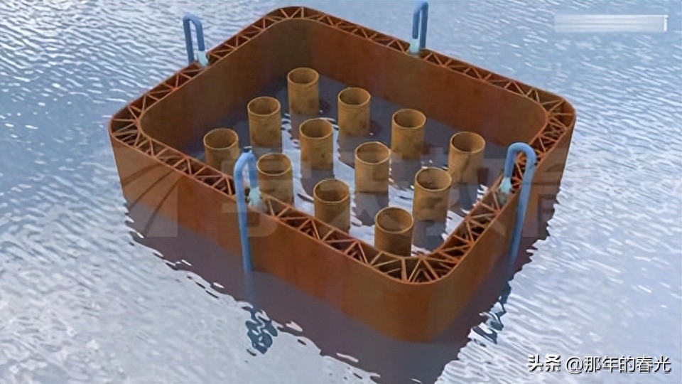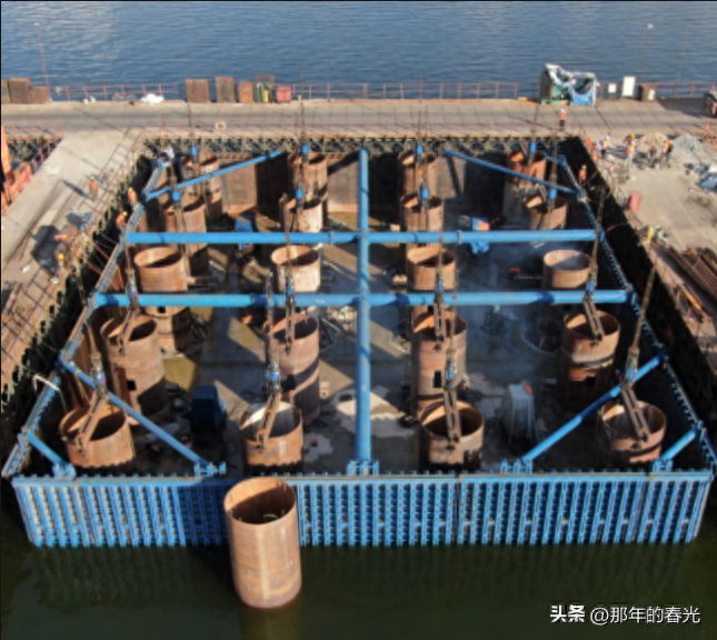首先,我们把大铁桶(双壁钢围堰)下到水底,一直下到海床上,然后用导管法在最底下灌注一层封底的混凝土,这样就可以把下面的底做成了,可以防止有水渗入。