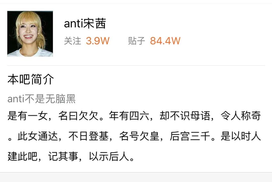 实际上,在贴吧时代宋茜anti吧的确是最出名的明星黑吧之一了,当时首页帖子的讨论度日均上百,每天有上千人签到。2018年anti宋茜吧有84万封帖子,关注量接近4万。宋茜无论参加是什么活动、采访,都会被一帧一帧截图嘲讽。