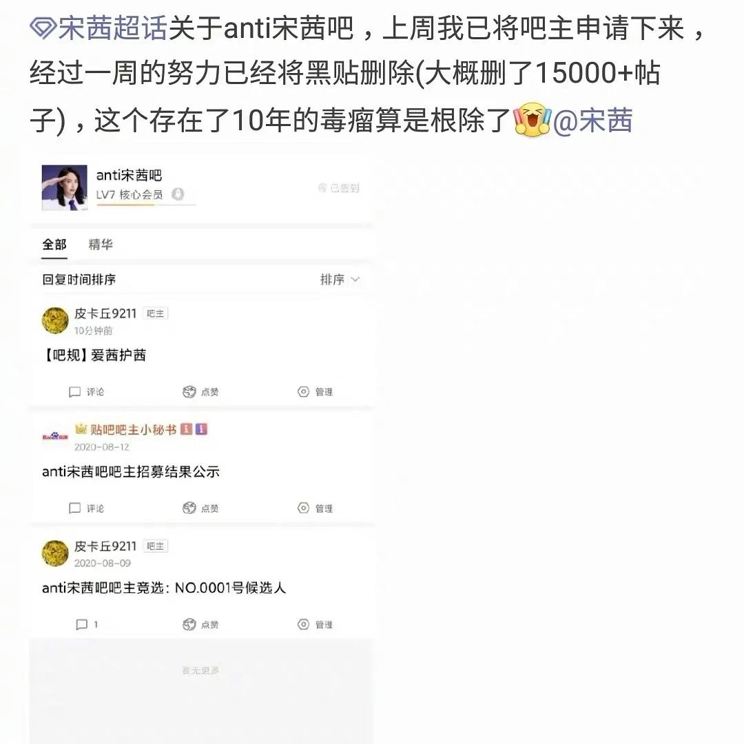 这位宋茜粉丝卧薪尝胆潜伏了anti宋茜吧十年,每天看着黑粉骂宋茜,最终成功申请为了anti宋茜吧吧主。并且,他在成为贴吧吧主后花费了一周的时间,删除了15000多个黑宋茜的帖子。