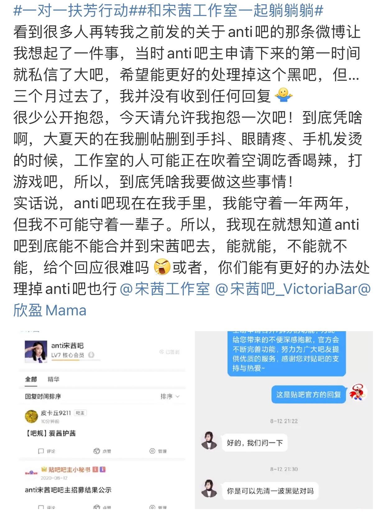 潜伏十年的宋茜粉丝在得到关注后也发文,表示自己在申请anti吧吧主成功后第一时间就私信了宋茜大吧,希望能更好地处理掉这个黑吧,但是一直没有得到回复。并且,他也表示自己潜伏十年很少抱怨的,但这次真的忍不住要抱怨工作室,自己删帖删到手抖,但是宋茜工作室的工作人员却消极怠工,为此很愤慨。