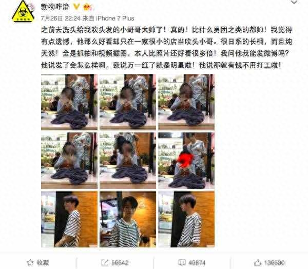 近日微博网友@勃物咋治发了一条微博,大概是说自己去理发店的时候,发现给他吹头的小哥哥长得超级帅。