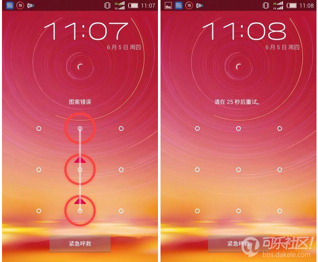 有意输错后30秒内不能再次尝试解锁在设定了解锁图案后,我们来到解锁界面,故意将图案画错,5次以后手机提示“您已连续5次密码输入错误,请在30秒后重试”。在这30秒内用户不能再进行解锁操作。