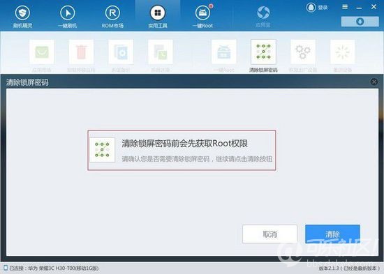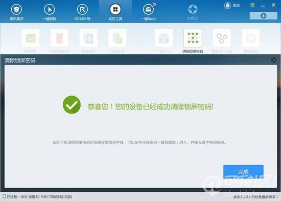 将手机用数据线连接到电脑,安装好驱动后打开USB调试连接刷机精灵。在上面截图画红框的实用工具位置,点开后你会发现有不少选项可以选择。按照图中所示的步骤,单击使用清除锁屏密码的工具,你会发现瞬间你的设备就已经成功清除锁屏密码,既不需要重启也不会丢失资料。值得一提的是,如果你发现密码锁屏界面还在,那也没关系,随便输入就可以进入,进去之后就赶紧换一个你熟悉的密码吧!
