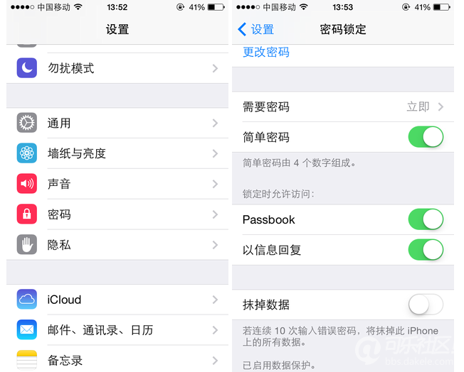 iPhone同样内置锁屏密码此外笔者也用一部iPhone 5进行测试,系统为iOS 7.1,我们可以在密码菜单中找到设置密码的选项,不过同Windows Phone系统一样也仅支持密码解锁。值得注意的是在开启“抹掉数据”功能后,一旦连续10次输入错误密码,则此机上的所有数据都将被清除。