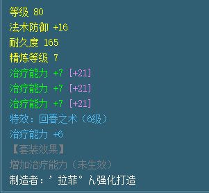 1.回春之术:治疗能力+(特效等级*1),4个部位特效相同。套装效果:治疗能力+X!8级(12)、16级(24)、24级(36)、28级(42)、32级(48)