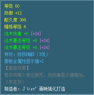 3.自我陶醉:面板全部属性点显示值增加(特效等级*1),4个部位特效相同。套装效果:若你将某个单位致死,则伤害显示值增加X%。8级(30%)、16级(50%)、24级(70%)、28级(80%)、32级(90%)