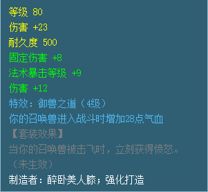 2. 御兽之道:(戒指)你的召唤兽进入战斗时增加(特效等级*7)点气血。(耳饰)你的召唤兽进入战斗时增加(特效等级*2)点防御。(佩饰)你的召唤兽进入战斗时增加(特效等级*2)点法防。(手镯)你的召唤兽进入战斗时增加(特效等级*1)点速度。套装效果:当你的召唤兽被击飞时,立刻获得X点愤怒。8级(8)、16级(16)、24级(24)、28级(28)、32级(32)